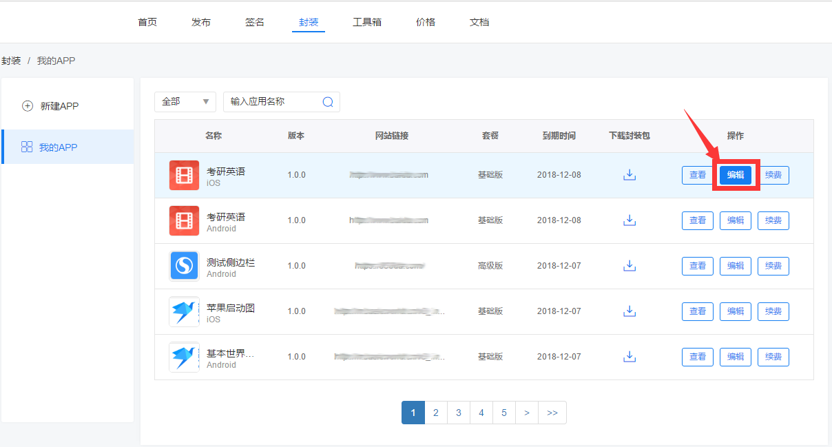 2. 申请到Key后,请在【封装-我的APP】中,点击编辑,在选择插件页,打开【第三方分享】的插件,输入Key值。